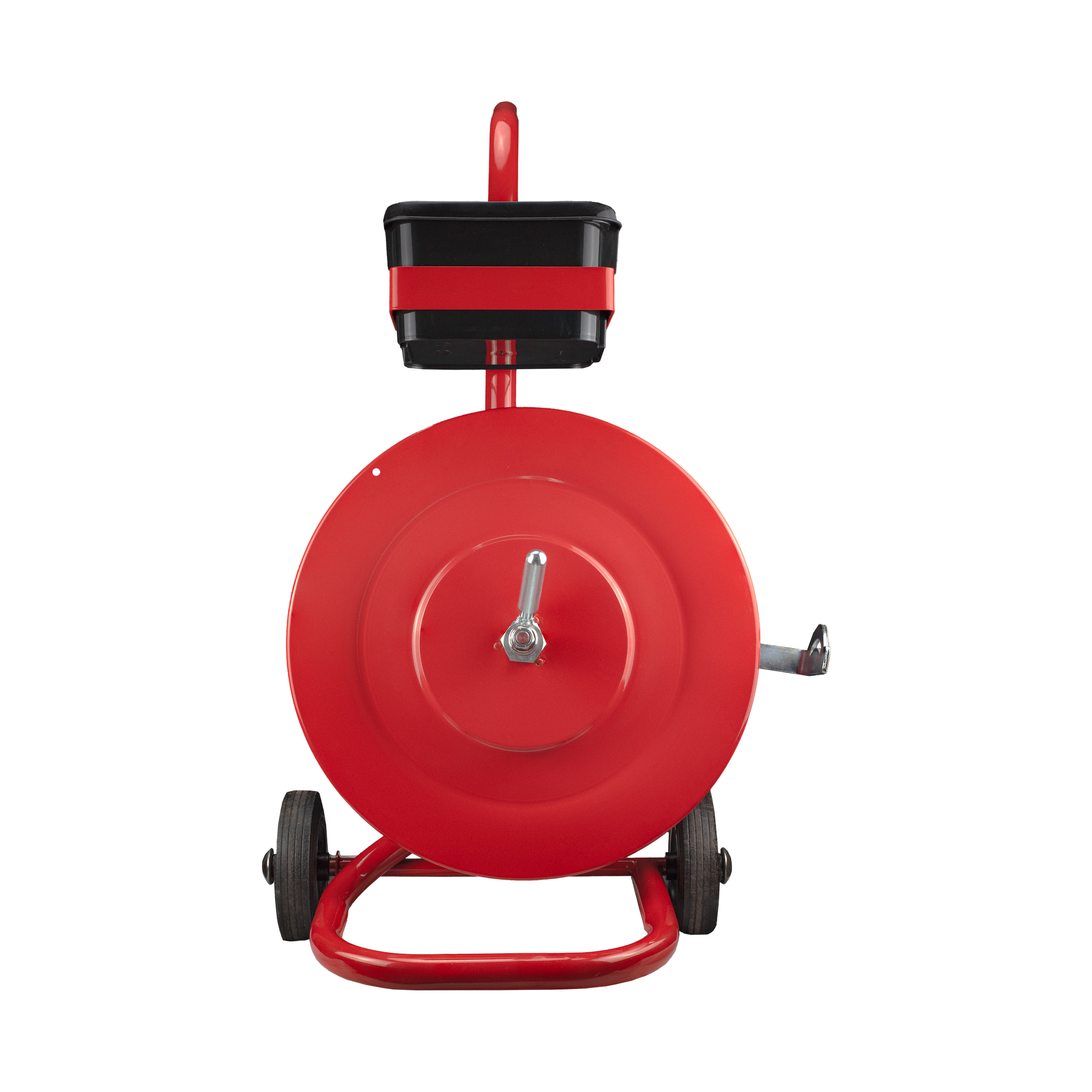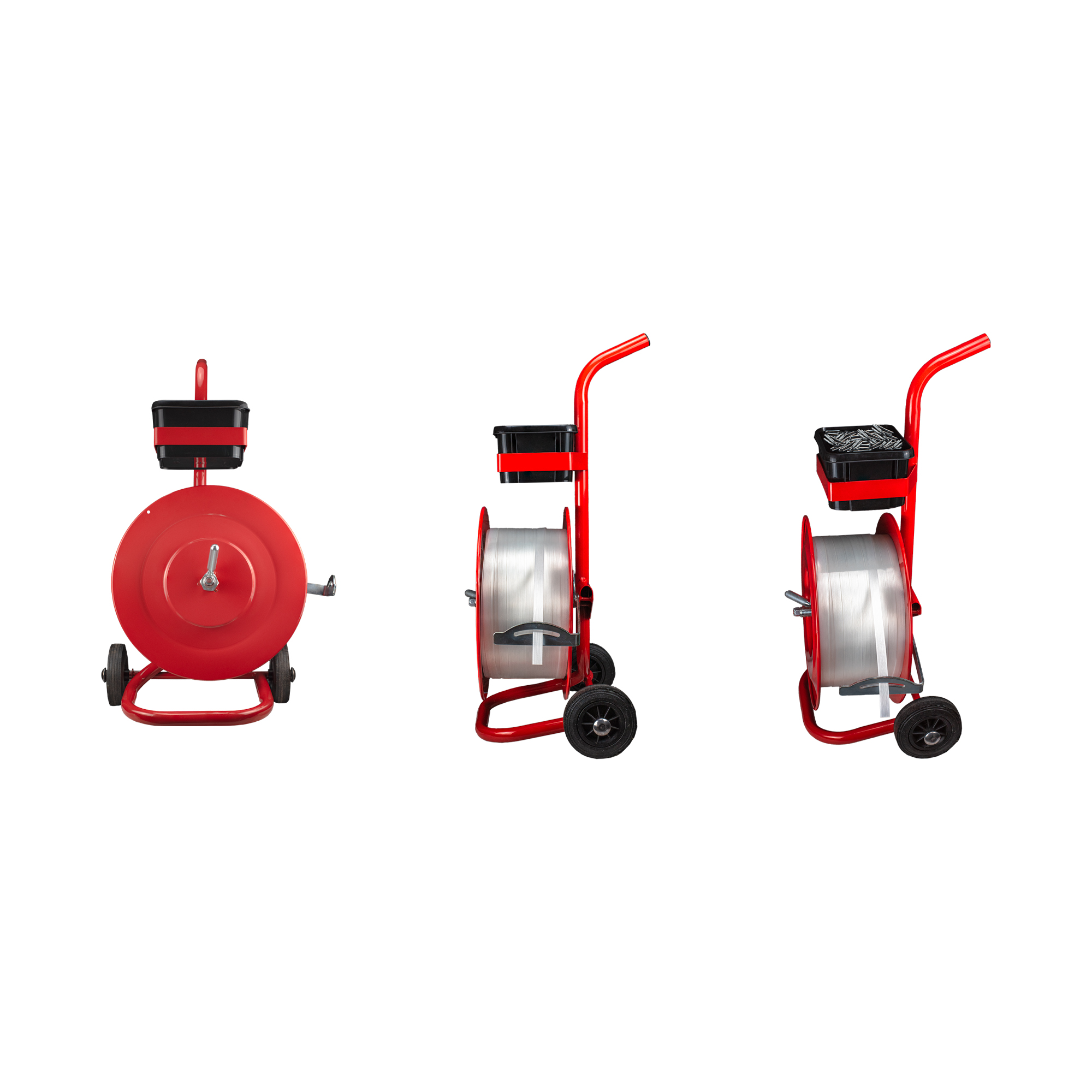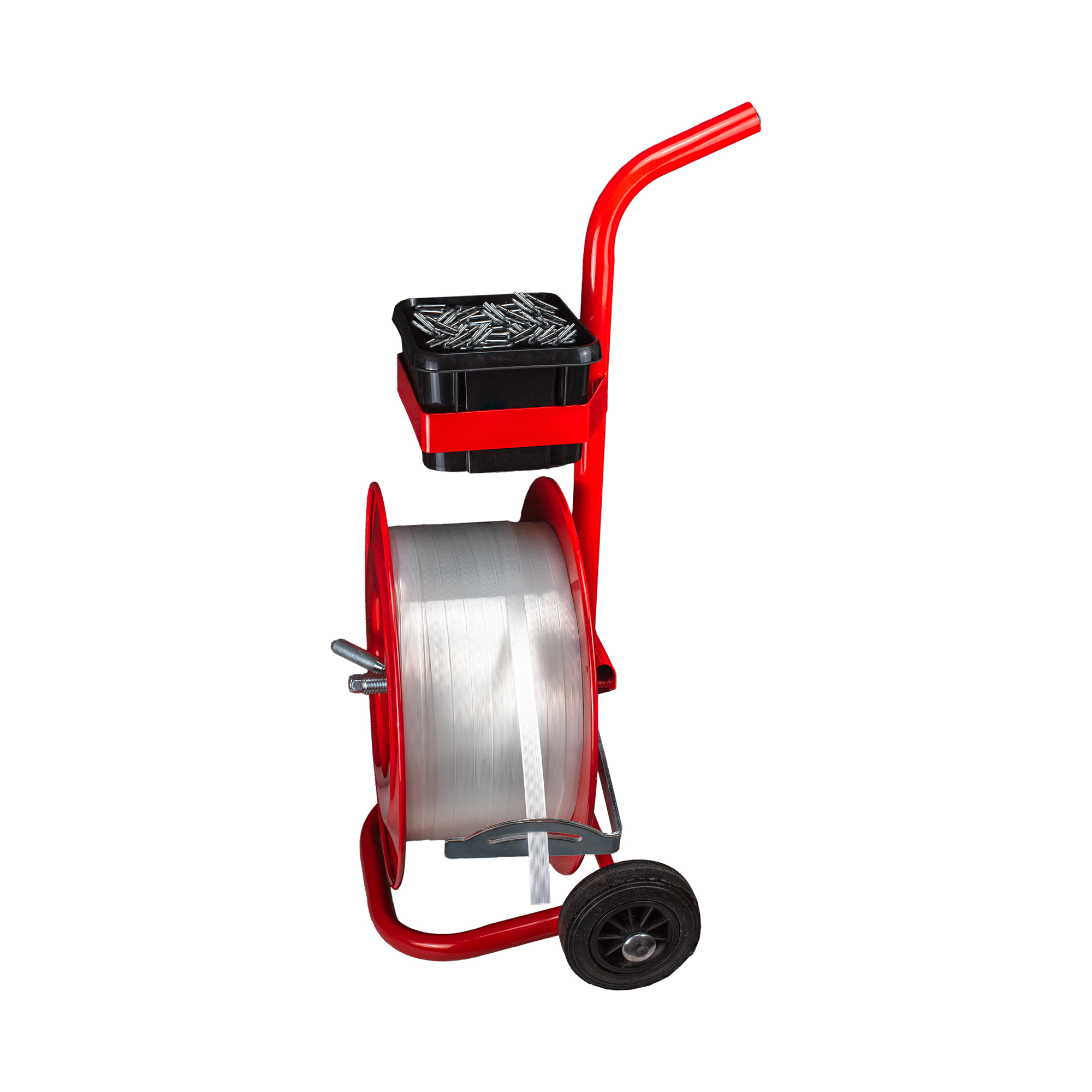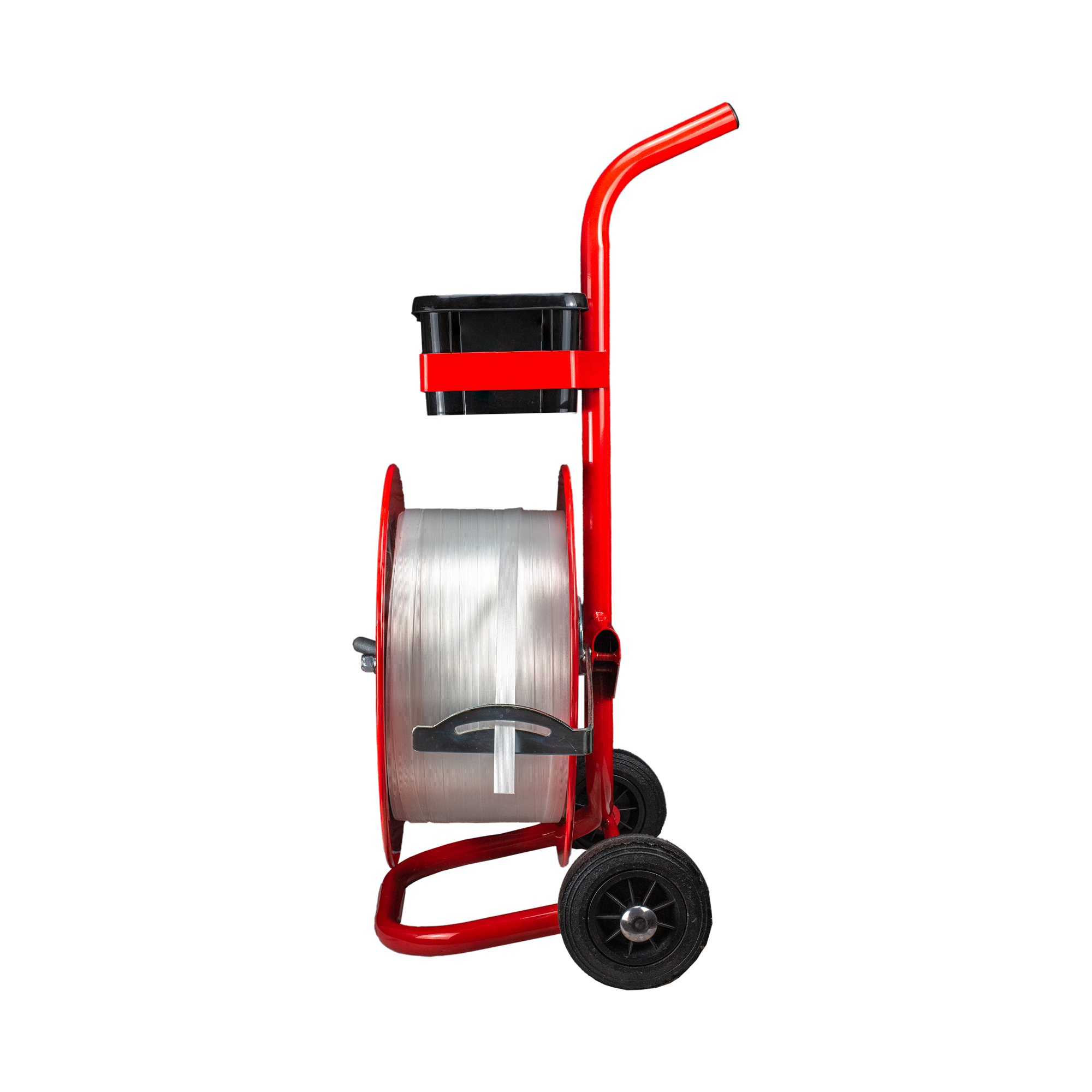 The Mega Fortris Mobile Strap Dispenser consists of a rugged tubular frame with 2 metal flanges to retain the coil strap, and a brake mechanism to prevent any strap overrun.